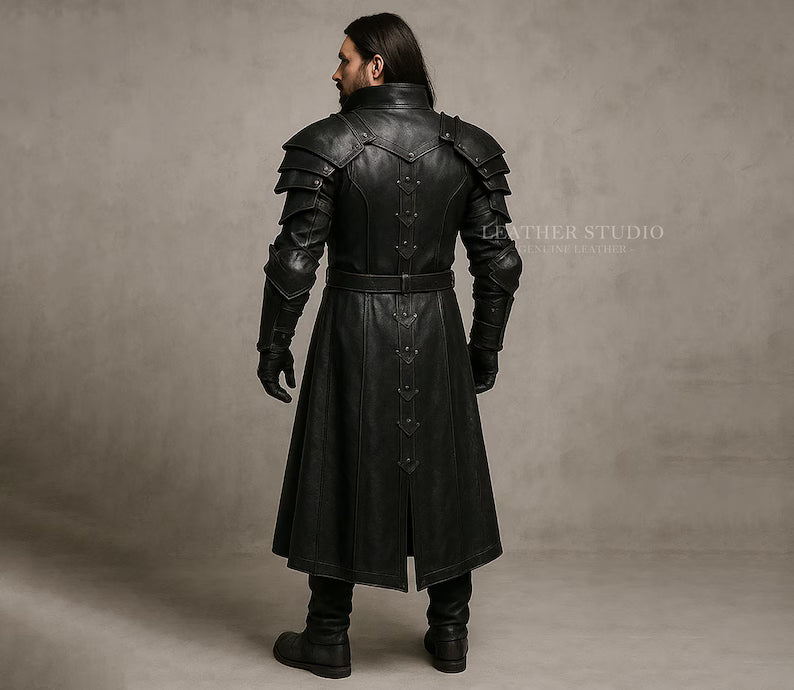 Step into a world of mystery and power with this Custom Made Black Leather Steampunk Armor Coat for Men, a bold fusion of gothic style, medieval warrior aesthetics, and steampunk fashion. Handcrafted from premium genuine leather, this trench coat features armor-inspired detailing, reinforced stitching, and a sleek tailored fit that delivers both strength and elegance. Its long coat design with steampunk elements makes it the perfect statement piece for cosplay, gothic festivals, LARP battles, biker fashion, or fantasy events.