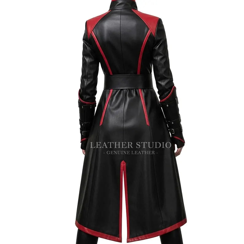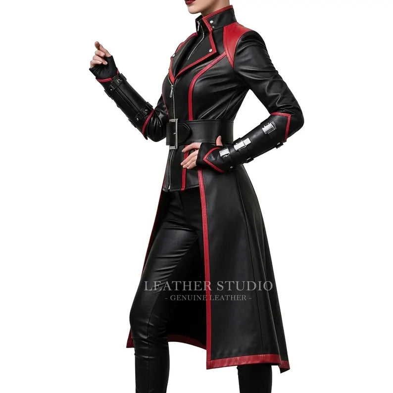 Command attention with this Handmade Women’s Black & Red Genuine Leather Long Coat . Designed from premium full-grain leather, this striking trench-style coat features bold red accents on a sleek black base. Ideal for cosplay, Gothic fashion, steampunk styling, Renaissance fairs, or festival wear, it combines elegance, power, and timeless craftsmanship. Created by Leather Studio, this piece is tailored to highlight the feminine silhouette while maintaining durability and comfort.