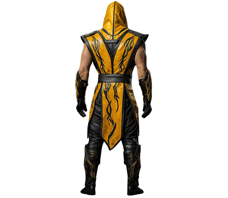 ⚔️ The gold and black battle armor he wears is no mere protection—it is a symbol of defiance, a mark of the warrior who fears nothing. This costume Scorpion Mortal Kombat style, with its flame-like patterns glowing with the fury of battles past, channels the spirit of the Mortal Kombat Scorpion cosplay. The hooded visage conceals his identity, making him a shadow of destruction. His presence on the battlefield is both a promise and a warning—the fight has already begun.