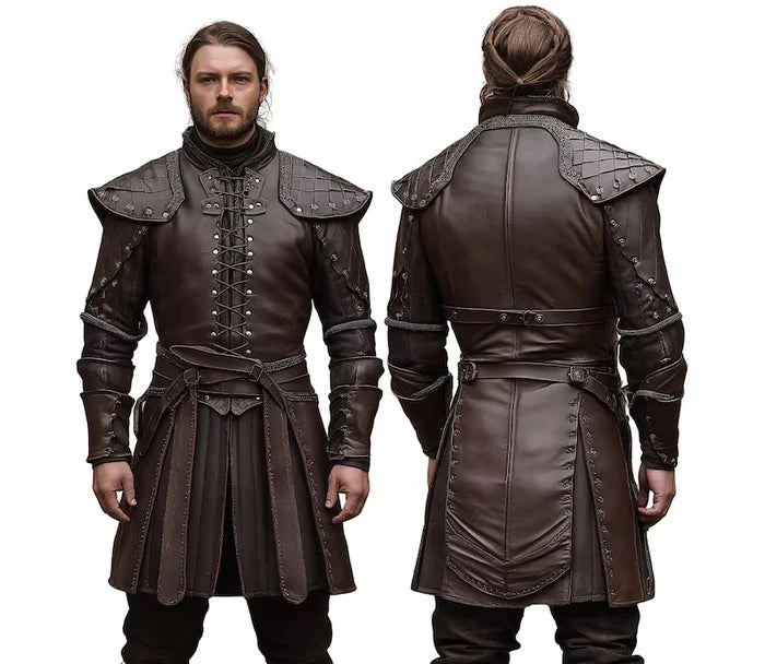 The deep brown leather, worn yet strong, speaks of endless hunts through thick forests and rugged lands. The reinforced shoulders bear the weight of battles past, while the intricate lacing and fitted design allow movement as swift as the wind. Every stitch, every buckle, every seam is a testament to the skill of a hunter who never hesitates—who never misses.